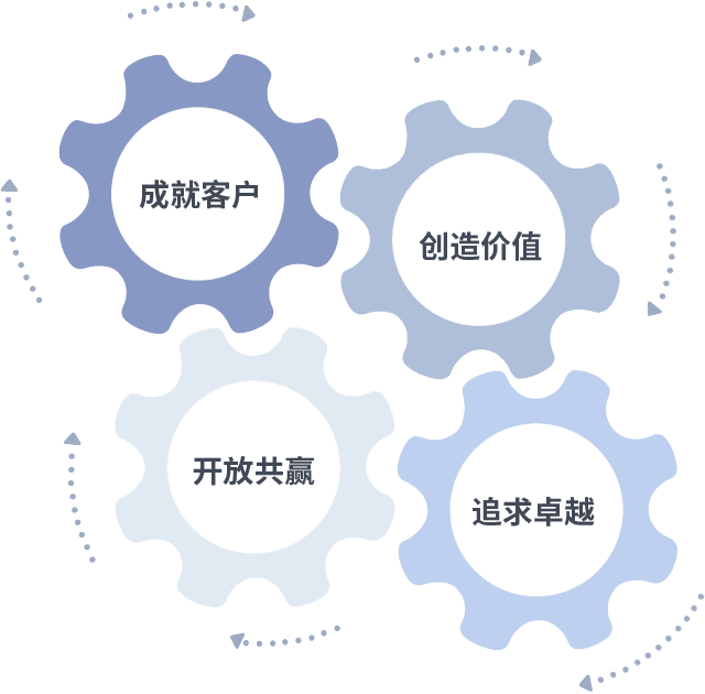 成就客户是一切决策的出发点,,创造价值是衡量所有工作的标准,,追求卓越是我们做事做人的态度,,开放共赢是我们的格局也是最终的结果。。。。价值观的齿轮环环相扣,,,,推动着组织里的每个人不断向前。。